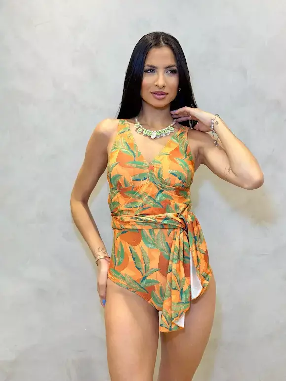 A estampa é exclusiva da marca, e a fabricação é própria, garantindo qualidade e autenticidade na peça. O modelo regata possui um recorte em V no busto, com um delicado franzido que proporciona maior sustentação. Além disso, o detalhe nas costas com amarração e o acessório dourado personalizado da marca trazem um charme extra ao look.